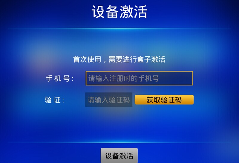 机顶盒安装好后首次进入【和家购】,需要验证激活: 1、按照系统提示输入用户手机号,点击【获取验证码】,验证码会发送至输入手机号码上。
