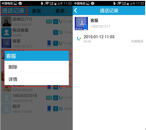 【通话记录】界面中长按需要编辑的联系人,直至跳出对话框。选择【删除】删除该联系人通话记录;选择【查看】查看该联系人完整联系记录。