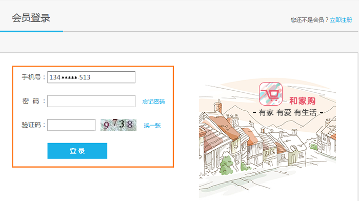 打开和家购手机APP,输入手机号→【获取验证码】→勾选“我已阅读并同意《服务协议》” →点击【确定】。