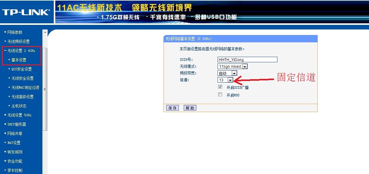 1. 若现场有多个无线路由器同时在工作,需要保证各路由器之间的信道不冲突。如下图所示,设置路由器的“无线设置” ->“基本设置”,点选“信道”为固定的某信道,如第一台无线路由器设置为13,则其他路由器同样设置的数值不能与此数值相同。即现场的有无线路由器的信道都不能相同。