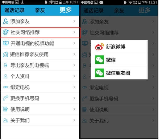 1、选择【更多】->【社交网络推荐】,选择QQ、微信平台发布推荐信息。