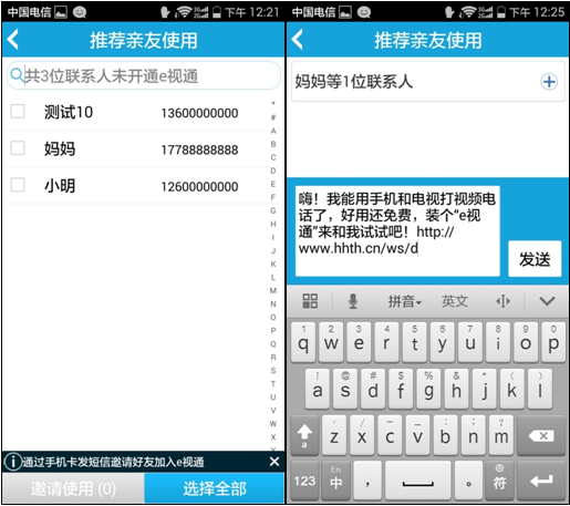 2、选择【更多】->【短信推荐亲友使用】->系统自动筛选没有开通和家购服务的号码->发送邀请短信。