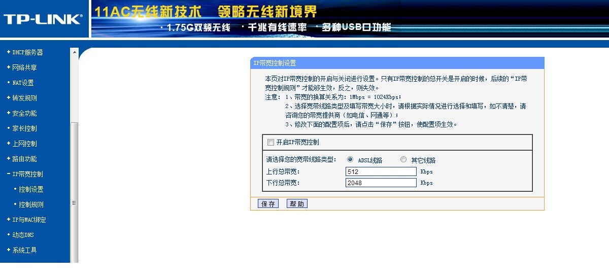 2.对电视盒子连接的路由器带宽需要设置。如下图所示,“IP带宽控制”->“控制设置”,勾选“启用IP带宽控制”,上行总带宽与下行总带宽都设置为10240Kbps,点选“保存”